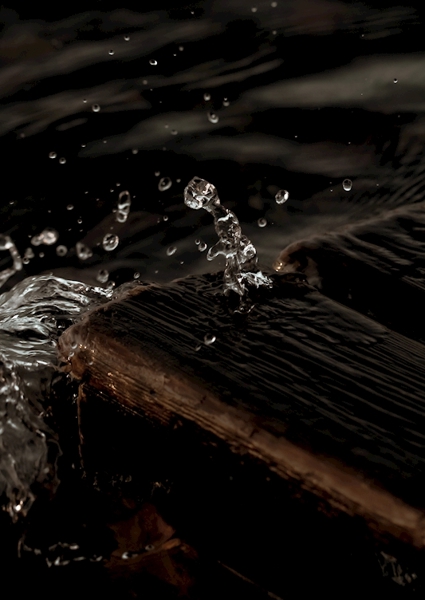 "Gå på vandet" poster af Frida Lundin. Vand møder træ i en øjeblikkelig kollision, hvor dråberne fanger lyset som små, flygtige eksplosioner. Mørket omkring forstærker kontrasten, og planken bliver både scene og deltager i det kaotiske spil. Det er som et snapshot af naturens egen dans – vild, uforudsigelig og alligevel smuk på sin helt egen måde. En slags poesi i bevægelse, der pirrer sanserne og får én til at tænke lidt over, hvad der egentlig sker lige under overfladen.