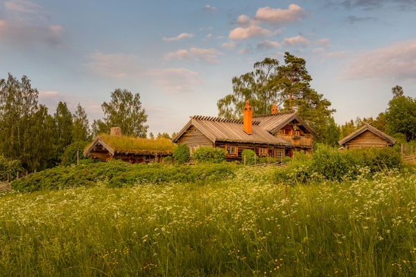 "Huset på landet " poster af ManaFoto. En træhytte, der nærmest hvisker ’kom væk fra byen’ midt i Dalarnas vilde, grønne landskab. Det stråtækte tag og de orange skorstene bryder blidt himlens ro, mens vilde blomster og højt græs danser rundt om huset. Det er som at træde ind i en anden tid – men på den gode måde, hvor alt bare føles ægte og afslappet. Perfekt til dem, der drømmer om et stille øjeblik væk fra hverdagens larm.
