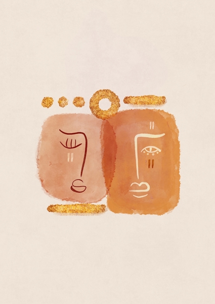 "Peacful færdiggørelse" poster af Emel Tunaboylu by The Artcircle. To ansigter, der smelter sammen i varme orange nuancer, fortæller en historie uden ord. Linjerne er enkle, men alligevel fyldt med følelser – lidt som en hemmelig kode mellem to sjæle. Baggrunden i blødt beige giver plads til fordybelse, mens formerne leger med balancen mellem det abstrakte og det genkendelige. Perfekt til dig, der elsker kunst, der både udfordrer og inviterer til snak over kaffen. Men altså… det her skaber stemning.