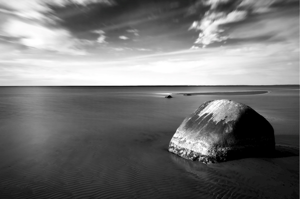 "Fordybelse 2" poster af Anders Jademyr. Sort/hvid minimalisme møder tidens stille øjeblikke i denne optagelse fra Skummeslöv, Sverige. En ensom sten hviler roligt mod det uendelige hav, mens horisonten smelter sammen med himlen – sådan et zen-øjeblik, man ikke lige ser hver dag. Sandets tekstur giver dybde, og alt sammen føles som en pause midt i kaosset. Perfekt til rum, der trænger til lidt eftertænksom ro. Men altså… det er mere end bare en sten, ikke?