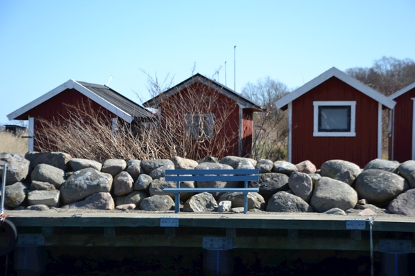 "Om sommeren" poster af Elisabet Bengtsson. En blå bænk står klar til at samle dagdrømme ved vandet – omgivet af robuste sten og de karakteristiske røde fiskerhytter, der kender Kiviks kyst som deres egen baghave. Himmelens klare blå spejler sig i den stille havn, hvor tid og tempo nærmest smelter sammen. Det er ikke bare et motiv, men en invitation til at falde ned, trække vejret dybt og bare være – helt uden solcreme og stress. Men altså… hvem kan modstå den her form for sommer?