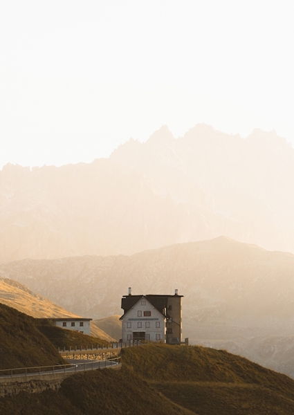 "Hus ved det schweiziske bjergpas" poster af Lukas Saalfrank. Et enkelt hus på Furkapasset i Schweiz, badet i den blide morgenlys. Det står der – helt alene – som en slags fredfyldt bastion midt i det dramatiske bjerglandskab. Lyset leger med konturerne af Alpernes vilde toppe, mens vejen snor sig forbi, og man kan næsten mærke eventyret ligge i luften. Perfekt til dig, der drømmer om stilhed, frihed og lidt vildskab pakket ind i et enkelt øjeblik. Men altså… hvem har ikke lyst til at køre derop og bare blive hængende?