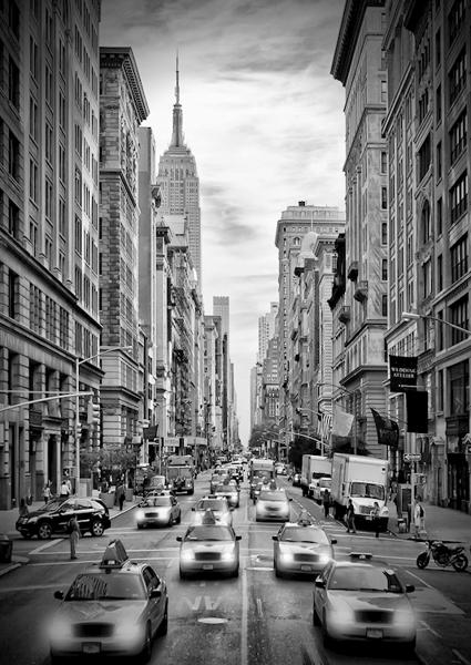 "NYC 5th Avenue Verkehr" poster af Melanie Viola. Byens puls fanges perfekt i dette sort-hvide øjebliksbillede af Fifth Avenue, hvor biler og cyklister kæmper sig gennem Manhattan-trafikken. Empire State Building tårner sig op i baggrunden som en evig vokter over den klassiske arkitektur, der strækker sig mod himlen. Et råt, urbant snapshot, der både hylder kaosset og energien i New Yorks hjerte – lige til at hænge op og lade dig mærke storbyens rytme hver dag.