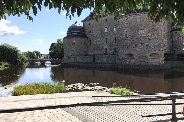 "Örebro Slot" poster af Gun Molinder. Det her er ikke bare en gammel borg, det er Örebro slot, der står og spejler sig i det stille vand som en tidskapsel fra fortiden. Stenene fortæller historier, mens liljerne dovent driver med strømmen – næsten som om tiden selv tager en pause her. Den grønne ramme oppefra og den rolige flod inviterer til at drømme sig væk. Perfekt til dig, der elsker når arkitektur møder natur i en uventet, men alligevel helt naturlig dans.