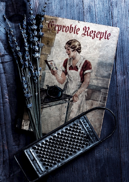 "Gammel kogebog" poster af Jürgen Wiesler. En gammel kogebog ligger åben på et rustikt, vejrbidt træbord – og ja, den der køkkenrive er ikke bare et redskab, men en trofast følgesvend i jagten på smag. Tørret lavendel lægger et subtilt strejf af nostalgisk charme, som om den hvisker historier om hjemmelavede retter og svundne tider. Det her er ikke bare et billede – det er en invitation til at dykke ned i det gode, gamle køkkenunivers, hvor hver opskrift gemmer på en hemmelighed. Perfekt til køkkenentusiasten, der elsker retro vibes og autenticitet.