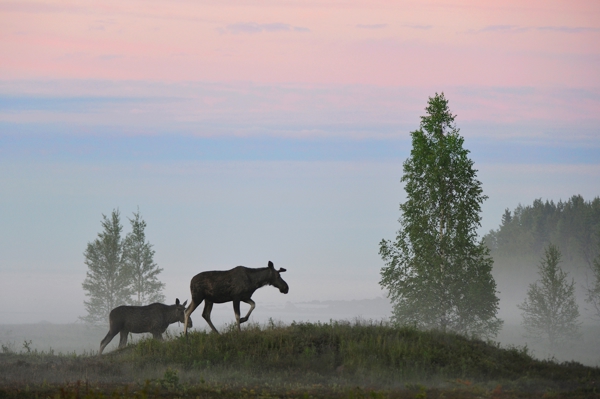 "Elg om sommeren nat" poster af Torbjörn Lilja. To majestætiske elge bevæger sig stille gennem den kølige sommertåge, mens himlens sarte pink toner langsomt smelter sammen med landskabets mystik. Det er som om naturen selv holder vejret – en øjeblikkelig pause i Västerbottens vilde hjerte, hvor ro og eventyr mødes. Perfekt til dig, der vil have lidt nordisk vildmark ind i stuen, uden at det bliver for meget. Bare... naturen, lige her.
