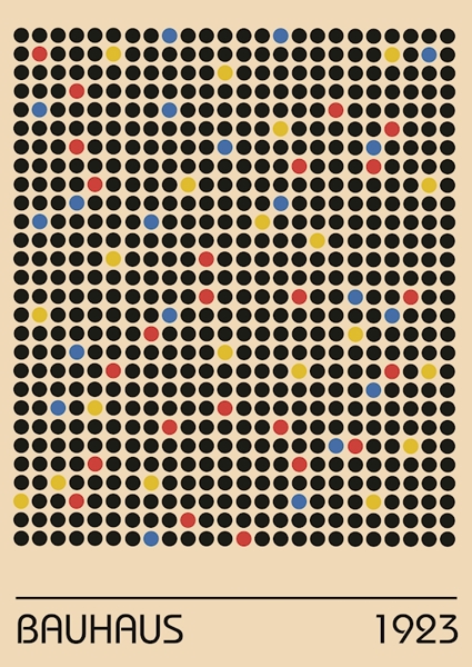"Bauhaus plakater" poster af William Gustafsson. Et spil med prikker, hvor sort dominerer, men de få blå, røde og gule prikker bryder rytmen og fanger øjet. Det er Bauhaus i sin reneste form – minimalistisk, men alligevel fuld af liv og bevægelse. En slags visuel dans fra 1923, der både hylder det gamle og peger mod det nye. Perfekt til den, der vil have kunst, der ikke bare hænger, men taler tilbage. En klassiker med kant til væggen.