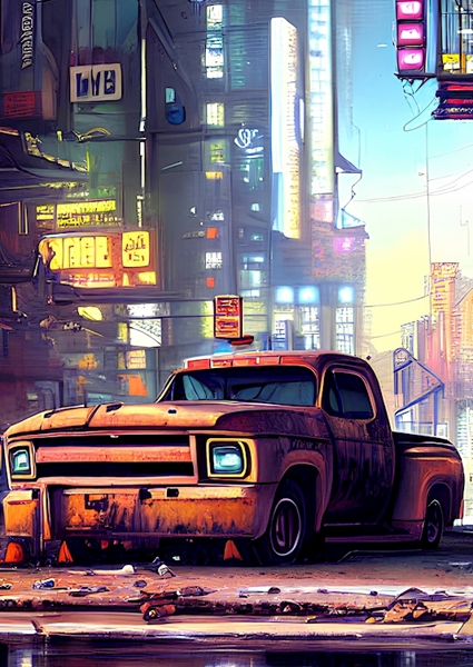 "This painting depicts an old truck sitting unused in the world of Cyberpunk. Cyberpunk typically features advanced science and technology and is set in an urban, dystopian setting occupied by police, large corporations, and privatized criminals. Inequality and social unrest are common themes and 'punk' in cyberpunk manifests itself in strong anti-authoritarian sentiments."