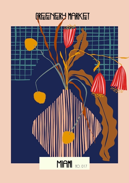 "Greenery Market Miami" poster by DESIGN d´annick. A vibrant floral still life that channels mid-century vibes with a modern twist. Bold colors pop against a minimalist backdrop, creating a playful yet sophisticated aesthetic. The abstract lines and retro shapes invite a sense of nostalgia while keeping it fresh and indie. Perfect for adding a splash of boho charm to any space, this artwork is a must-have for those who appreciate the beauty of nature and design. Miami's essence captured in a single frame!