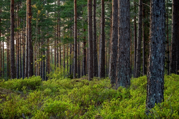 "Tallskogen" poster by Klas Andersson. Immerse in the serene vibes of a pine forest at dusk. Tall, majestic pine trees stand like guardians, while vibrant blueberry bushes carpet the forest floor. The evening light filters through the branches, casting a warm glow that dances with the greenery. This artwork captures that magical moment when nature whispers secrets, inviting you to take a breath and just be. Perfect for those who crave a touch of tranquility in their space.