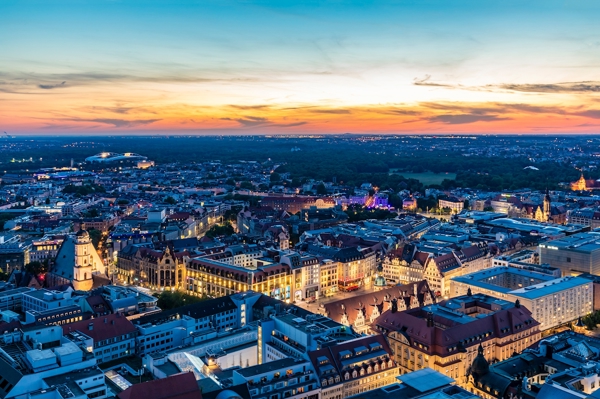 "A bird's-eye view of Leipzig. View over the historic city center with St. Thomas Church, the old city hall and the market place."