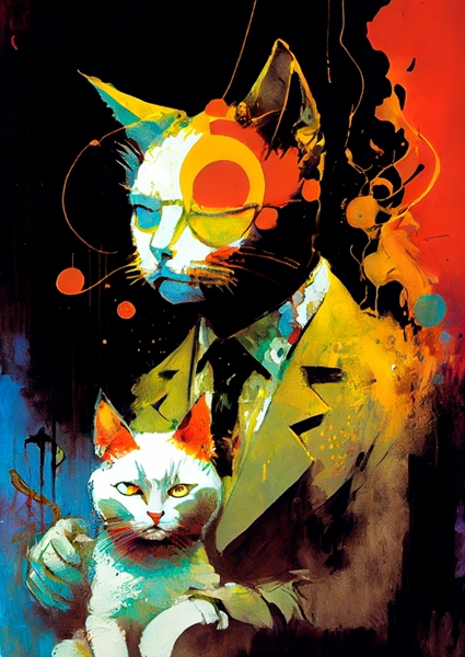 "Catnip I 10" poster by El Rico Grande. A vibrant explosion of color meets surrealism in this striking artwork. Picture a dapper feline, complete with glasses and a suit, cradling a regal cat. The bold splashes of paint create a dreamlike atmosphere, blurring the lines between reality and imagination. It’s a playful nod to the absurd, inviting viewers to ponder who’s really in charge here. This piece is a must-have for anyone who appreciates the quirky side of art – a true conversation starter!