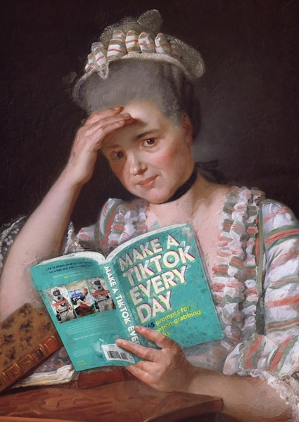"Make a Tik Tok is a piece that ironically and humorously portrays the phenomenon of social media, bringing a neoclassical portrait into a new modern context. Through a clever collage, this piece changes the traditional meaning of the artwork, reflecting the influence of digital culture."