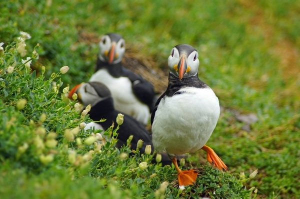 "Hopping Puffin" poster by Babetts Bildergalerie. Meet the Hopping Puffin – a charming little bird strutting its stuff on the lush meadows of Skellig Michael, Ireland. With its vibrant orange feet and quirky expression, this puffin hops around like it owns the place. Surrounded by a sea of greenery and delicate flowers, it’s a playful scene that captures the essence of nature's whimsy. Perfect for anyone who loves wildlife and wants a slice of Irish charm in their space.