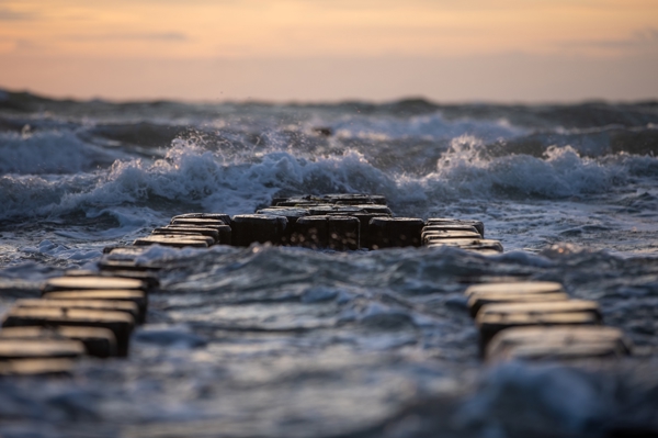 "Groynes in the Baltic Sea" poster by Thomas Bugdoll. Experience the raw beauty of the Baltic Sea with this striking artwork. Waves crash against sturdy groynes, creating a dynamic interplay of water and light. The horizon glows with a soft sunset, casting a warm hue over the turbulent sea. Each block tells a story of resilience against nature's forces. Perfect for those who appreciate coastal landscapes and the ever-changing moods of the ocean. Bring a piece of this captivating scene into your space.