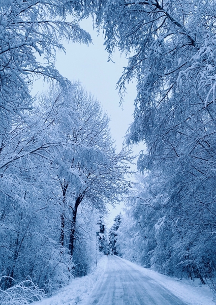 "Winterwonderland" poster by Malin Besson . Step into a winter wonderland where every inch is draped in pristine snow. This serene alley, nestled in Falun, Dalarna, invites you to wander through a dreamy landscape. The cool blues and whites create a tranquil atmosphere, making it feel like a scene pulled straight from a fairy tale. With trees arching overhead, this artwork captures the essence of a cold, clean winter day—perfect for those who crave the beauty of nature in its purest form.