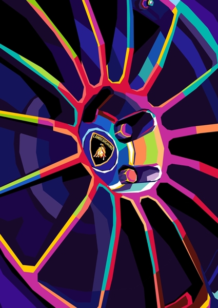 "lamborghini" poster by Shichiro Ken. This artwork captures the essence of speed and luxury with a vibrant twist. The close-up of a Lamborghini wheel bursts with bold colors and sharp lines, creating a dynamic visual experience. It’s like a pop-art explosion, merging automotive power with a playful, retro vibe. The iconic logo stands out, hinting at the prestige behind the design. Perfect for those who appreciate the fusion of art and engineering, this piece revs up any space with its energetic flair.