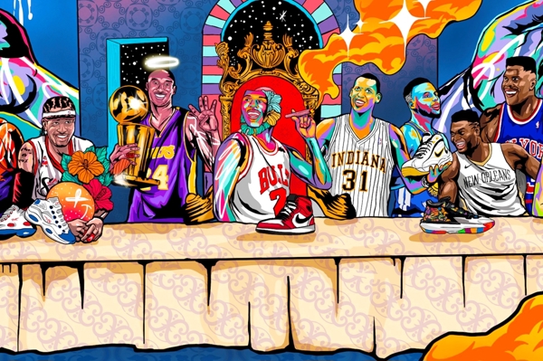 "The Last Supper NBA" poster by My Kido. This vibrant artwork reimagines a classic scene with a modern twist—think basketball legends gathered around a table, each representing their iconic teams. The colors pop, with a playful mix of nostalgia and contemporary flair. From Kobe's signature moves to the Bulls' dynasty, every detail screams sports culture. It's a celebration of motivation and legacy, blending the essence of the NBA with a cheeky nod to history. Perfect for any fan looking to elevate their space!