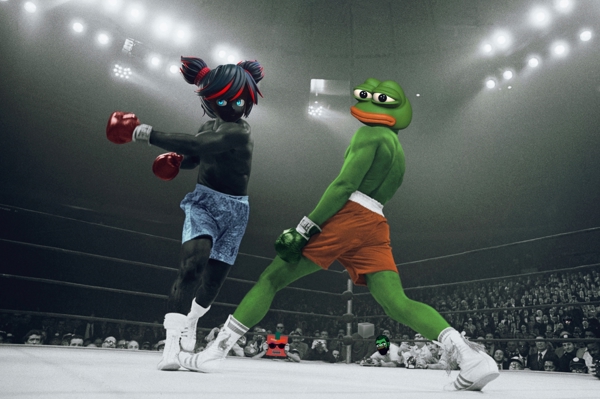 "Pepe Boxing" poster by My Kido. Step into the ring with this playful pop art piece featuring the iconic Pepe in a boxing showdown. The vibrant green frog, decked out in classic boxing shorts, faces off against a fierce opponent, blending humor and nostalgia in a retro arena. The artwork captures the essence of memes and modern culture, making it a perfect conversation starter. It's a fun twist on the boxing genre that brings a smile and a punch of personality to any space.