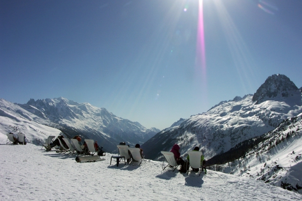 "From Chamonix we took the ski lift as far up as you could go. Then slid down the first hill on the skis and was rewarded with a moment's rest in the sun at the stunning view of the Alps."