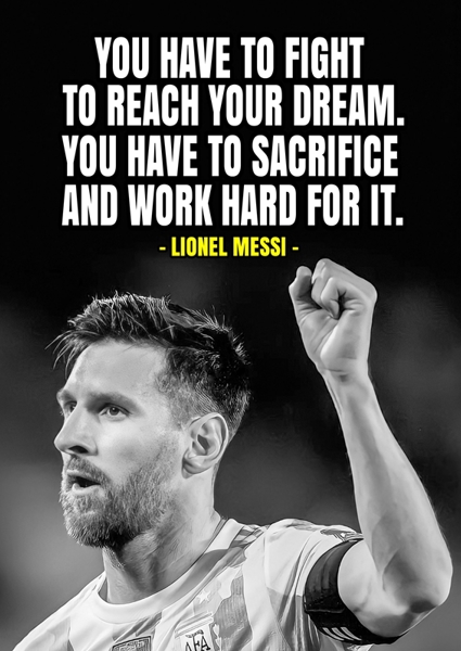 "Motivational Quotes by Messi" poster by Herry Gunawan. This striking artwork captures the essence of determination with a bold black-and-white silhouette of Lionel Messi, fist raised in triumph. The motivational quote echoes his relentless spirit: "You have to fight to reach your dream. You have to sacrifice and work hard for it." Perfect for anyone chasing their goals, this piece blends inspiration with the iconic presence of a football legend. A must-have for dreamers and doers alike!