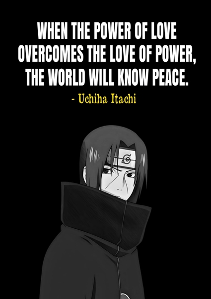 "Itachi Quotes " poster by Herry Gunawan. Dive into the wisdom of Uchiha Itachi with this striking text art. Bold, black background meets powerful words – “When the power of love overcomes the love of power, the world will know peace.” Itachi’s iconic presence adds depth, making this piece not just a quote, but a vibe. Perfect for fans of Naruto and anyone seeking a daily dose of motivation. Hang it up, let it inspire, and embrace that peace.