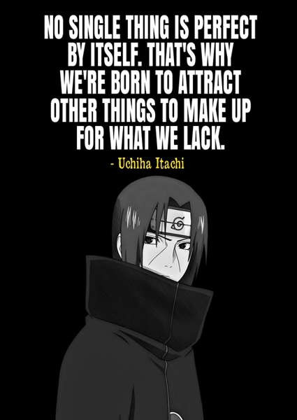 "Itachi Quotes " poster by Herry Gunawan. Dive into the world of Uchiha Itachi with this striking text art piece. Bold quotes pop against a sleek black backdrop, echoing the wisdom of a character who knows that perfection is a team effort. Itachi’s contemplative gaze invites reflection on the beauty of connection and growth. Perfect for anime lovers and motivational seekers alike, this artwork serves as a daily reminder that we all complement each other’s strengths and weaknesses. Embrace the journey of attraction and self-discovery!