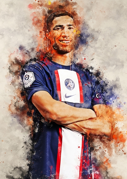 "Achraf Hakimi" poster by Tian Arina. This artwork captures the vibrant energy of Achraf Hakimi, the Moroccan football sensation. Drenched in splashes of color, it’s like a celebration of movement and passion. The dynamic pose, arms crossed, exudes confidence—perfectly embodying his role at PSG. The abstract background adds a layer of excitement, making it feel alive, almost like a moment frozen in time. A must-have for any football fan or art lover looking to add a splash of flair to their space!
