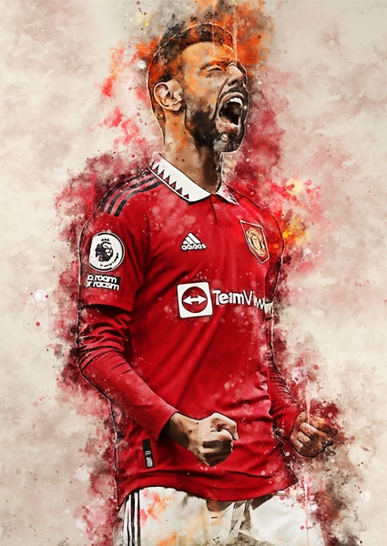 "Bruno Fernandes" poster by Tian Arina. This artwork captures the electrifying spirit of Bruno Fernandes, the Portuguese dynamo of Manchester United. Bursting with energy, the vivid colors and dynamic brush strokes reflect his passion on the pitch. The fiery backdrop symbolizes the intensity of football, while his triumphant pose exudes confidence and determination. Perfect for any fan, this piece embodies the essence of modern soccer culture—bold, vibrant, and unapologetically alive. A must-have for those who live and breathe the beautiful game.