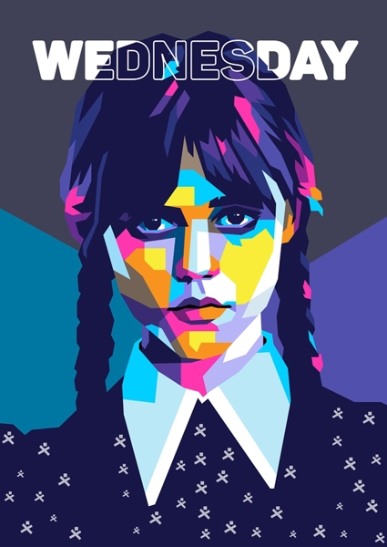 "Wednesday Addams" poster by V Styler. Dive into the vibrant world of Wednesday Addams with this striking artwork. Featuring a bold, colorful WPAP style, the piece captures her iconic look—pale skin, dark pigtails, and that signature deadpan stare. The geometric shapes and vivid hues create a retro vibe that screams cool. Perfect for fans of the macabre and those who appreciate a playful twist on nostalgia. This is not just art; it’s a statement piece for any space.