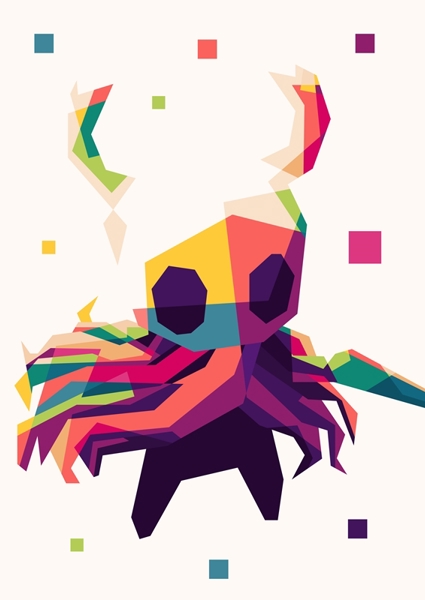 "Hollow Knight" poster by Color Work. Dive into the vibrant world of "Hollow Knight" with this stunning pop art illustration. Crafted in the distinctive WPAP style, it reimagines the iconic character using bold geometric shapes and a kaleidoscope of colors. The playful arrangement keeps the essence of the original while transforming it into a modern masterpiece. Perfect for gamers and art lovers alike, this piece adds a splash of whimsy and nostalgia to any space. Embrace the indie gaming vibe and let this artwork spark joy!