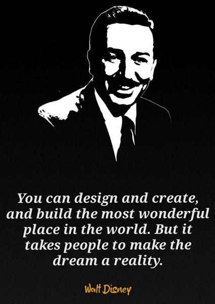 "Walt Disney Quotes " poster by Dylanzz. This artwork captures the iconic spirit of Walt Disney, blending inspiration with a touch of nostalgia. The bold black-and-white portrait contrasts sharply with the motivational quote, reminding us that dreams need a team to thrive. It’s like a pep talk from the man himself – a call to action for dreamers and doers alike. Perfect for any space that craves a sprinkle of creativity and a dash of Disney magic. Bring home this piece and let the dream-building begin!
