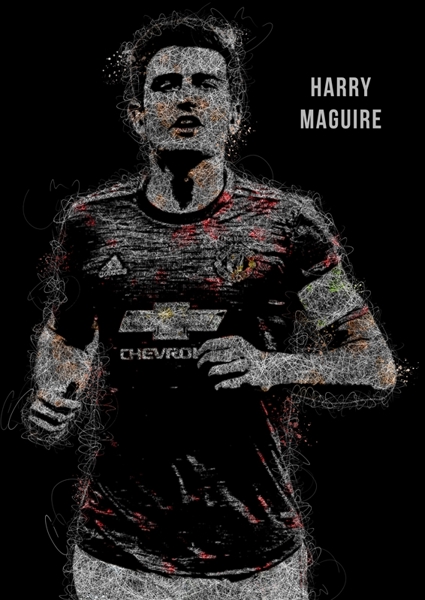 "HARRY MAGUIRE" poster by Last Art. This artwork captures the essence of Harry Maguire in a striking, abstract style. The dynamic lines and textures create a sense of movement, reflecting the energy of a Premier League match. Clad in Manchester United's iconic kit, Maguire stands tall, embodying strength and determination. The dark background contrasts sharply with the vibrant details, making the figure pop. It’s a bold tribute to a player who’s always in the spotlight—perfect for any football fan looking to elevate their space.