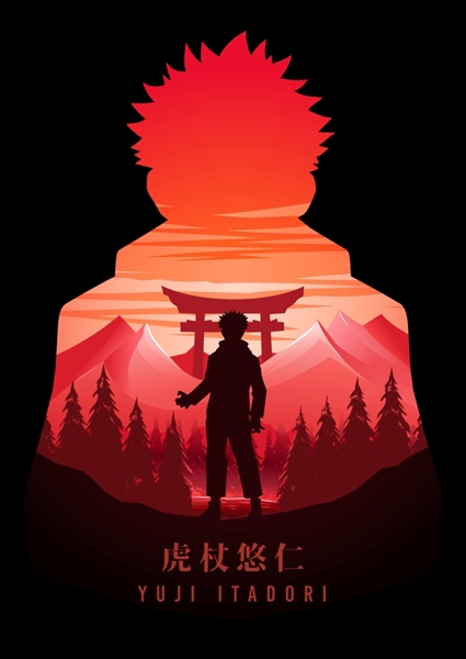 "Yuji Itadori Jujutsu Kaisen" poster by Illust Artz. Dive into the world of Jujutsu Kaisen with this striking minimalist illustration of Yuji Itadori. The artwork captures the essence of a hero standing tall against a backdrop of vibrant reds and deep shadows, evoking a sense of adventure and mystique. Silhouetted against a dramatic landscape, the iconic torii gate hints at the rich cultural roots of Japan. Perfect for anime lovers, this piece blends modern aesthetics with a nostalgic nod to classic manga vibes. A must-have for any fan!