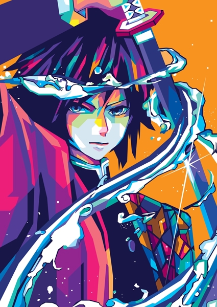 "Giyu Tomioka" poster by V Styler. Dive into the vibrant world of Giyu Tomioka, the Water Hashira from Demon Slayer: Kimetsu no Yaiba. This artwork bursts with color, showcasing Giyu in a dynamic pose, sword raised and water swirling around him. The geometric shapes and bold hues create a striking contrast against the vivid orange background. It’s a visual feast that captures the essence of strength and fluidity, perfect for fans who appreciate the blend of modern artistry and classic anime vibes. A must-have for any collector!
