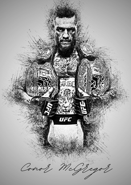 "Conor McGregor" poster by Sketch Art. This artwork captures the fierce essence of Conor McGregor – the embodiment of a champion. With his iconic belts draped over his shoulders, the intricate sketching style brings out the raw intensity of his persona. The bold lines and striking details reflect the grit of the UFC world, while the subtle textures add depth. It’s not just a portrait; it’s a statement. Perfect for fans of MMA and anyone who appreciates the art of fighting.