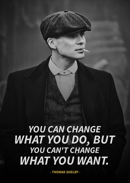 "Thomas Shelby quotes " poster by Takoyakiii. This striking illustration captures the essence of Thomas Shelby, the iconic character from *Peaky Blinders*. With a bold silhouette and a classic black-and-white palette, it features a powerful quote that resonates deeply: "You can change what you do, but you can't change what you want." Perfect for fans of the series, this artwork blends motivation with a touch of grit, making it an ideal statement piece for any space. Embrace the spirit of ambition and determination with this unique text art.