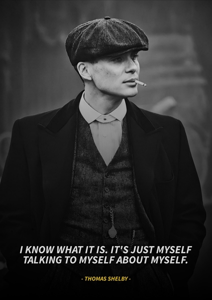 "Peaky Blinders quotes " poster by Takoyakiii. This striking artwork captures the essence of Thomas Shelby from Peaky Blinders, blending a bold black-and-white silhouette with a powerful quote. The image exudes a gritty, vintage vibe, perfectly reflecting the show's raw energy. The text, "I know what it is. It's just myself talking to myself about myself," resonates with anyone seeking motivation and self-reflection. Ideal for fans of the series, this piece adds a touch of rebellious charm to any space—perfect for those who appreciate a bit of attitude in their decor.