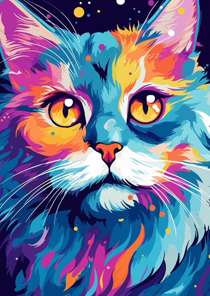 "Cute Cat Animal Pop Art" poster by Qreative. Step into a kaleidoscope of color with this stunning animal pop art piece! A vibrant feline stares back, its fur a whirlwind of electric blues, fiery oranges, and playful purples. Those big, expressive eyes? Pure magic. This artwork fuses the wild beauty of nature with a pop culture twist, making it a standout addition to any space. Perfect for cat lovers and art enthusiasts alike, it’s a visual feast that demands attention. Get ready to be captivated!