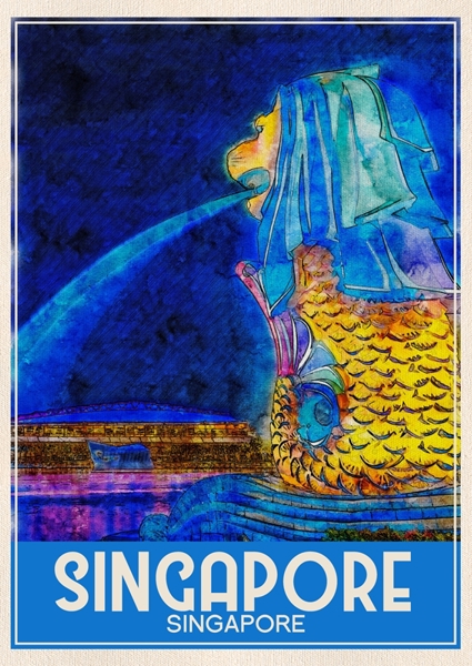 "The poster captures the essence of Singapore, with its stunning skyline, lush greenery, and the majestic Merlion statue standing proudly by the waterfront. Hang it proudly and let the scenic beauty around the Merlion statues infuse your space with a sense of wonder that defines this remarkable city."