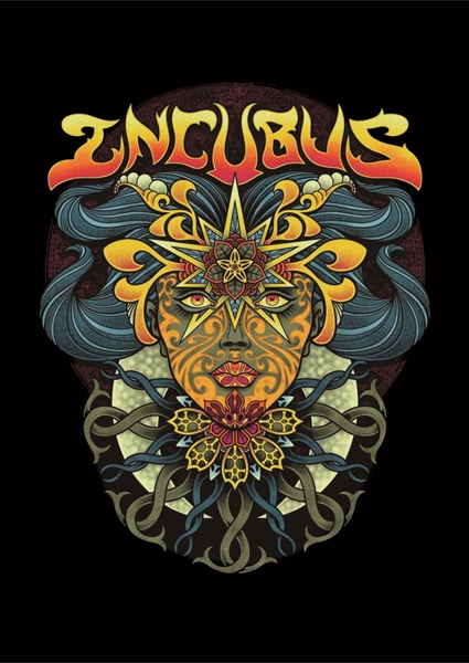 "Incubus" poster by Johnny Wonder. Dive into a visual feast with this striking artwork that screams vintage rock vibes. The intricate patterns and bold colors create a mesmerizing tapestry, drawing the eye to the central figure adorned with floral motifs and swirling hair. It’s like a psychedelic journey through sound and style – a nod to the legends of music and art. Perfect for those who appreciate a blend of humor, sarcasm, and a touch of the surreal. This piece is not just art; it’s a statement.