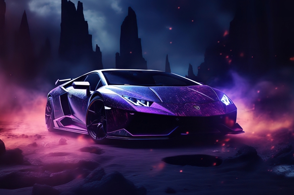 "A Lamborghini Aventador in a dark magic place with glowing sparks and haze. For all Car Fans."