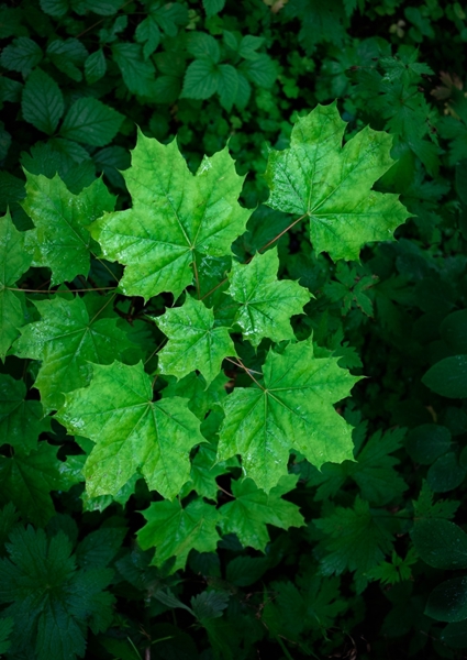 "Budding greenery in the form of maple leaves growing at the edge of the forest."