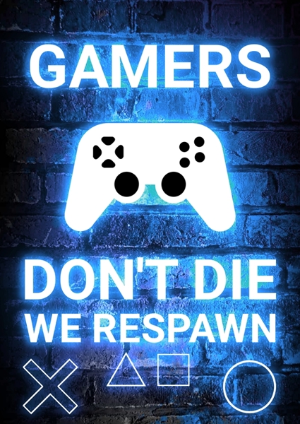 "gamer " poster by Tanxiao art. Bright neon vibes collide with gamer culture in this electrifying artwork. The bold statement "Gamers Don't Die, We Respawn" shines against a gritty backdrop, capturing the essence of resilience in the gaming world. Featuring a sleek game controller, this piece is a must-have for any gamer’s space. It’s not just decor; it’s a mantra for those who live for the next level. Perfect for adding a pop of color and motivation to any room. Level up your wall game!