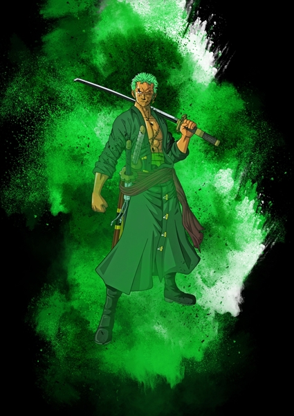 "Roronoa zoro green brush" poster by Perrin lamy. Dive into the world of One Piece with this vibrant artwork featuring Roronoa Zoro. The fierce swordsman stands tall, exuding confidence against a backdrop of dynamic green brush strokes. His signature look—complete with that unmistakable sword—captures the essence of loyalty and strength. Perfect for fans of the Straw Hat Pirates, this piece brings a touch of adventure and boldness to any space. Embrace the spirit of the high seas and let Zoro inspire your journey!