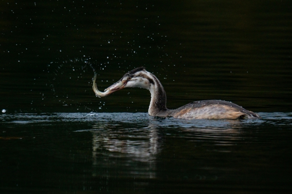 "It was on a rainy day when this picture was taken. I was at a photo spot at a lake and after several hours of waiting, this great crested grebe swam right in front of me and fished its dinner."