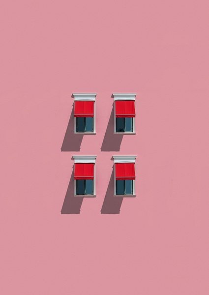 "Red Awnings on Pink Wall" poster by Meanwhile In Nowhere. A striking minimalist shot that’s all about balance and color. Four windows, each dressed in bold red awnings, pop against a soft pink wall. The shadows stretch out like playful whispers, adding depth to this architectural gem. It’s like a contemporary art piece that makes you think about the simplicity of structures—sand castles in disguise. Perfect for those who appreciate the beauty in minimalism and a splash of color.