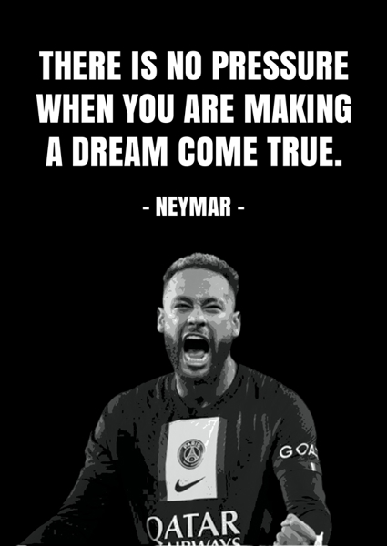 "Neymar Jr Quotes" poster by ARTEXT. This artwork captures the electrifying spirit of Neymar Jr. with a bold, striking quote that resonates deeply. Set against a sleek black backdrop, the typography pops, emphasizing the motivational message: “There is no pressure when you are making a dream come true.” It’s a perfect blend of inspiration and sportsmanship, ideal for any football fan or aspiring athlete. This piece not only decorates a wall but ignites passion and determination—perfect for those chasing their own dreams.