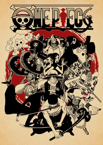"One Piece" poster by Illust Artz. Dive into the vibrant world of One Piece with this striking artwork featuring the iconic Straw Hat Pirates. Bold black silhouettes pop against a fiery red backdrop, showcasing beloved characters like Luffy, Zoro, and Nami in a dynamic, vintage style. This piece captures the adventurous spirit of the classic anime and manga, making it a must-have for fans and collectors alike. Perfect for adding a touch of nostalgia and excitement to any space.