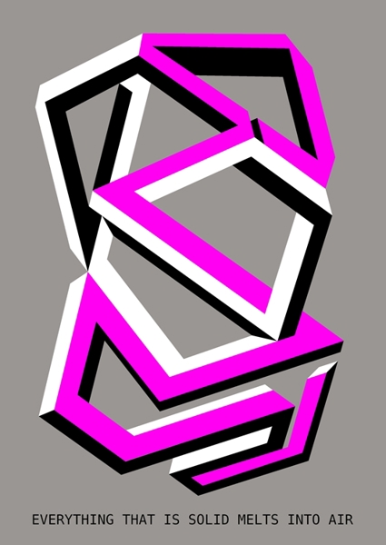"Lila Karl" poster by June E. Miller. Dive into the abstract world of Lila Karl – where geometry and color collide in a playful dance. This post-minimalist piece features bold pinks and stark blacks and whites, creating a dynamic visual tension. The phrase "Everything that is solid melts into air" anchors the artwork, inviting contemplation on the fluidity of form and perception. Perfect for modern spaces, this piece is a conversation starter that challenges the boundaries of graphic design.